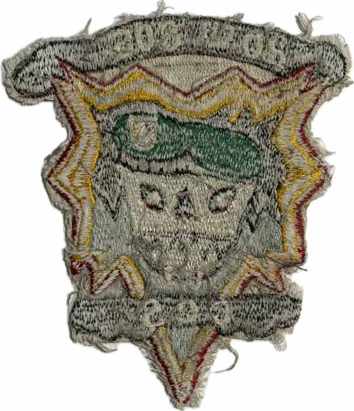 Wartime, Japanese machine embroidered, Military Assistance Command Vietnam Studies and Observations Group (MAC V SOG), Command and Control South (CCS), US Air Force 20th Special Operations Squadron bomb burst patch that measures about 4 1/2 inches tall and was removed from a uniform. (APCI-4591)