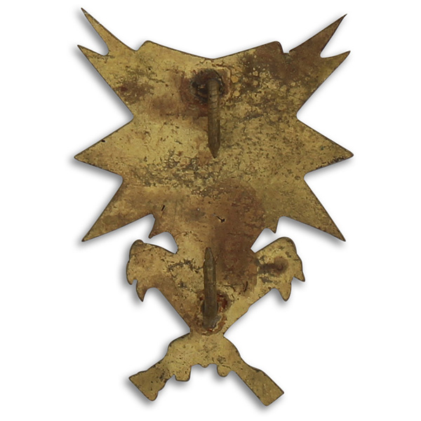 Wartime, Vietnamese manufactured, Military Assistance Command Vietnam Studies and Observations Group (MAC V SOG), Forward Operational Base #1 (FOB#1), Phu Bai, brass body beer-can. The insignia measures about 1 1/2 inches tall with two post on the reverse. (APM-1126)
