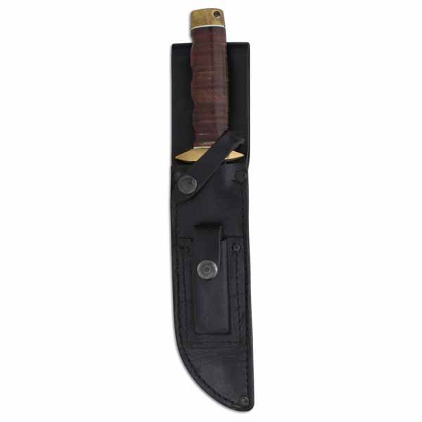 The knife measures about 10 1/2 inches overall with a 6″ dark blued blade that does show sharpening that can be seen in the pictures. The piece comes with the proper leather scabbard missing the stone. The knife overall shows honest wear and is considered a USER.